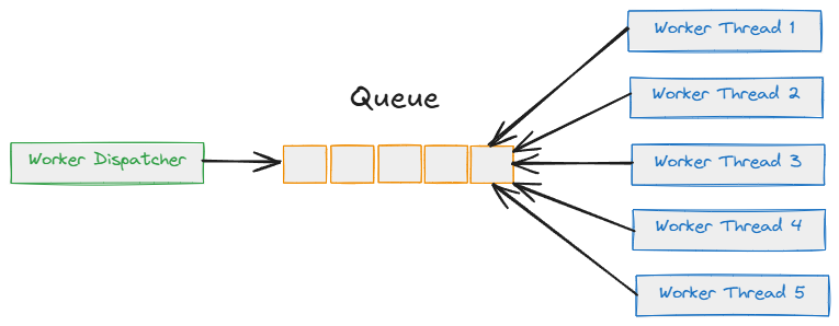 This means that the Queue (a data structure stored in the heap memory) is a shared resource between threads. This enables efficient CPU usage and allows for low latency, as there’s no need to create a new thread for every new event.